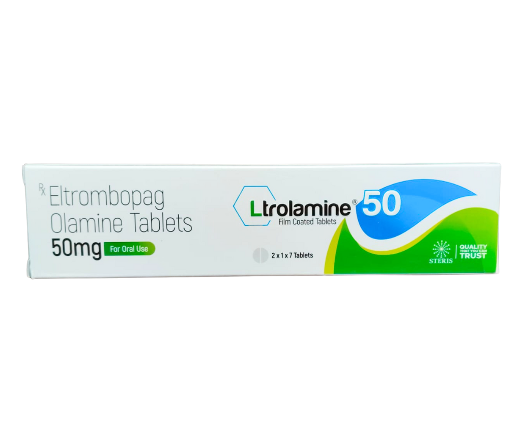 LTROLAMINE 50 contains Eltrombopag Olamine Tablets 50 mg, a clinically proven oral medicine used to manage low platelet count (thrombocytopenia). Platelets play a vital role in blood clotting, and reduced platelet levels can increase the risk of bleeding and bruising. LTROLAMINE 50 is commonly prescribed in specific blood-related disorders where platelet production is insufficient. Developed with strict quality standards, this medicine helps stimulate platelet production in the bone marrow, supporting safer platelet levels and improving patient outcomes. It is widely used under medical supervision as part of long-term or condition-specific treatment plans. Uses of LTROLAMINE 50 LTROLAMINE 50 is primarily used in the treatment of conditions associated with low platelet count, including: Chronic Immune Thrombocytopenia (ITP) in adults who do not respond adequately to corticosteroids or immunoglobulins Severe Aplastic Anaemia, where bone marrow fails to produce enough blood cells Thrombocytopenia associated with chronic hepatitis C, especially in patients requiring antiviral therapy By increasing platelet production, LTROLAMINE 50 helps reduce bleeding risk and supports continuity of essential treatments. Benefits of Eltrombopag Olamine Tablets 50 mg LTROLAMINE 50 offers several therapeutic benefits: Helps increase and maintain platelet count within a safer range Reduces the risk of spontaneous bleeding and bruising Oral tablet form ensures convenient and non-invasive administration Supports patients requiring ongoing treatment where low platelets limit therapy options Clinically validated molecule with predictable and targeted action Regular monitoring ensures effective and safe long-term use as advised by healthcare professionals. Dosage The dosage of LTROLAMINE 50 should always be decided by a doctor based on the patient’s medical condition, platelet levels, and response to treatment. Usually taken once daily, preferably on an empty stomach Avoid taking it with dairy products, calcium supplements, or iron-rich foods as they may reduce absorption Dosage adjustments may be required based on blood test results Patients should not change the dose or stop the medicine without medical advice. Side Effects Like all medicines, LTROLAMINE 50 may cause some side effects, although not everyone experiences them. Commonly reported side effects include: Headache or fatigue Nausea or stomach discomfort Increased liver enzymes in blood tests Muscle pain or body aches Rare but serious side effects may include liver-related issues or blood clotting problems. Regular blood tests are essential to monitor platelet levels and liver function during treatment. Precautions and Warning Before starting LTROLAMINE 50, patients should inform their doctor about any existing medical conditions, especially liver disease, blood clotting disorders, or pregnancy. Not recommended for self-medication Use with caution in patients with liver impairment Regular monitoring of platelet count and liver function is mandatory Pregnant or breastfeeding women should use it only if clearly prescribed Do not combine with supplements containing calcium, magnesium, or iron without medical guidance Following medical instructions strictly helps ensure safety and effectiveness. Conclusion LTROLAMINE 50 (Eltrombopag Olamine Tablets 50 mg) is a trusted therapeutic option for managing thrombocytopenia associated with chronic blood disorders. By stimulating platelet production, it plays a crucial role in reducing bleeding risks and improving quality of life. With proper medical supervision, regular monitoring, and adherence to prescribed guidelines, LTROLAMINE 50 offers reliable support for patients requiring sustained platelet management. Always consult a healthcare professional for personalised advice and optimal treatment outcomes.