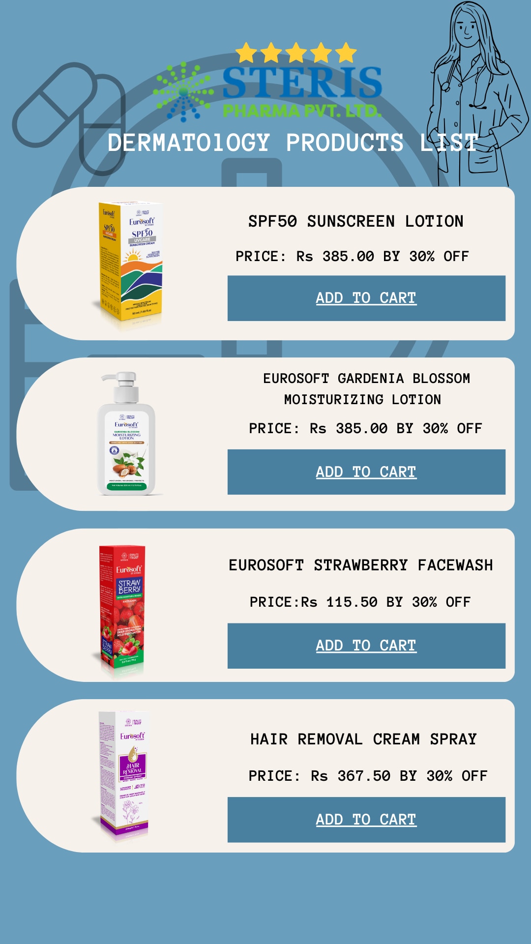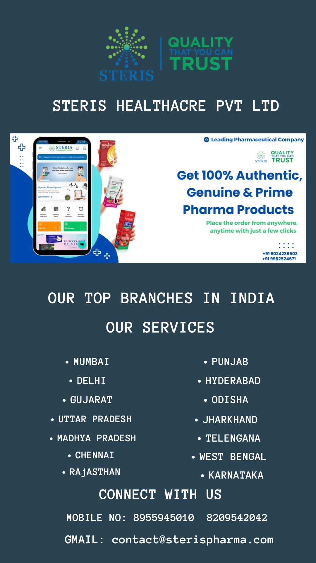 Steris Healthcare Pvt Ltd, known as sterispharma, was founded in February 2018 by a team of experienced professionals in the pharmaceutical industry. Headquartered in Navi Mumbai, the company holds certifications from WHO, GMP, and ISO, reflecting its dedication to maintaining high standards of quality and safety. Steris Healthcare pvt ltd mission is to provide affordable, high-quality medications across India, strictly adhering to WHO guidelines. With the convenience of an online pharmacy, customers can easily order medicines with home delivery options. The company offers a wide range of healthcare products, catering to various medical needs, from rare disease treatments to essential healthcare products. Sterispharma's product range includes solutions for Cardiology, Asthma, Respiratory Issues, Nasal Conditions, Diabetes, Endocrinology, Gastroenterology, Orthopedics, Anti-infectives/Antibiotics, General Medicine, Urology, Neurology, Nephrology, Oncology, Gynecology, Pediatrics, Dental Care, and Dermatology. Medicines can be conveniently ordered via Our websites—Sterisonline, Sterisindia, and Sterispharma.