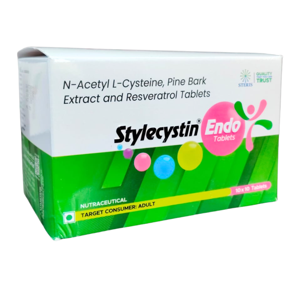 STYLECYSTIN ENDO is a scientifically formulated antioxidant tablet containing N-Acetyl L-Cysteine (NAC), Pine Bark Extract, and Resveratrol. This advanced combination is designed to provide powerful cellular protection, support hormonal balance, and promote overall metabolic wellness. In today’s fast-paced lifestyle, oxidative stress, inflammation, and environmental toxins can impact reproductive health, metabolic function, and immune response. STYLECYSTIN ENDO works by addressing these concerns at the cellular level. The synergistic action of N-Acetyl L-Cysteine, Pine Bark Extract and Resveratrol Tablets makes STYLECYSTIN ENDO particularly beneficial for individuals requiring antioxidant support, hormonal regulation, and improved insulin sensitivity. This formulation is commonly recommended in clinical practice to support women’s reproductive health, especially in conditions associated with oxidative stress and metabolic imbalance. Uses of STYLECYSTIN ENDO STYLECYSTIN ENDO tablets are commonly used as supportive therapy in the following conditions: Management of oxidative stress-related disorders Support in Polycystic Ovary Syndrome (PCOS) management Improvement of insulin sensitivity Hormonal balance support Enhancement of reproductive health Support for cardiovascular wellness General antioxidant supplementation N-Acetyl L-Cysteine helps replenish glutathione levels in the body, which is one of the most important natural antioxidants. Pine Bark Extract and Resveratrol further enhance antioxidant protection while supporting vascular and metabolic health. Benefits of N-Acetyl L-Cysteine, Pine Bark Extract and Resveratrol Tablets 1. Powerful Antioxidant Protection Oxidative stress is a major contributor to hormonal imbalance and metabolic disturbances. STYLECYSTIN ENDO provides triple antioxidant support. N-Acetyl L-Cysteine (NAC) boosts glutathione production. Pine Bark Extract contains proanthocyanidins that protect cells from free radical damage. Resveratrol supports cellular longevity and reduces oxidative injury. 2. Supports Hormonal Balance This formulation is widely used as supportive therapy in women with hormonal irregularities. NAC may help regulate ovulatory function, while resveratrol has been studied for its potential role in supporting endocrine balance. 3. Improves Insulin Sensitivity Insulin resistance is a key concern in metabolic and reproductive disorders. NAC and resveratrol help improve insulin function, which may assist in better metabolic regulation. 4. Enhances Reproductive Health STYLECYSTIN ENDO is often recommended as part of reproductive health management. It supports ovarian function by reducing oxidative stress, thereby promoting overall reproductive wellness. 5. Supports Cardiovascular Health Resveratrol and Pine Bark Extract are known for promoting vascular health, improving circulation, and supporting heart wellness. 6. Boosts Immunity and Cellular Defense By increasing glutathione levels, NAC enhances the body’s natural defense mechanism against toxins and infections. Dosage The dosage of STYLECYSTIN ENDO should be taken as advised by a registered healthcare professional. General recommended usage: One tablet daily after meals Or as directed by the physician depending on clinical condition It is important to maintain regular intake for optimal benefits. Do not exceed the prescribed dose without medical consultation. Side Effects STYLECYSTIN ENDO is generally well tolerated when taken in recommended doses. However, some individuals may experience mild side effects. Possible side effects may include: Mild gastric discomfort Nausea Headache Bloating Allergic reactions (rare) These symptoms are usually temporary. If severe reactions such as persistent vomiting, rash, or breathing difficulty occur, medical attention should be sought immediately. Patients with pre-existing medical conditions should inform their healthcare provider before starting supplementation. Conclusion STYLECYSTIN ENDO, containing N-Acetyl L-Cysteine, Pine Bark Extract and Resveratrol Tablets, offers a comprehensive antioxidant and metabolic support solution. Its unique triple-action formula helps combat oxidative stress, improve insulin sensitivity, support hormonal balance, and enhance reproductive health. The synergistic blend of NAC, Pine Bark Extract, and Resveratrol makes this formulation particularly valuable in managing metabolic and endocrine-related concerns.