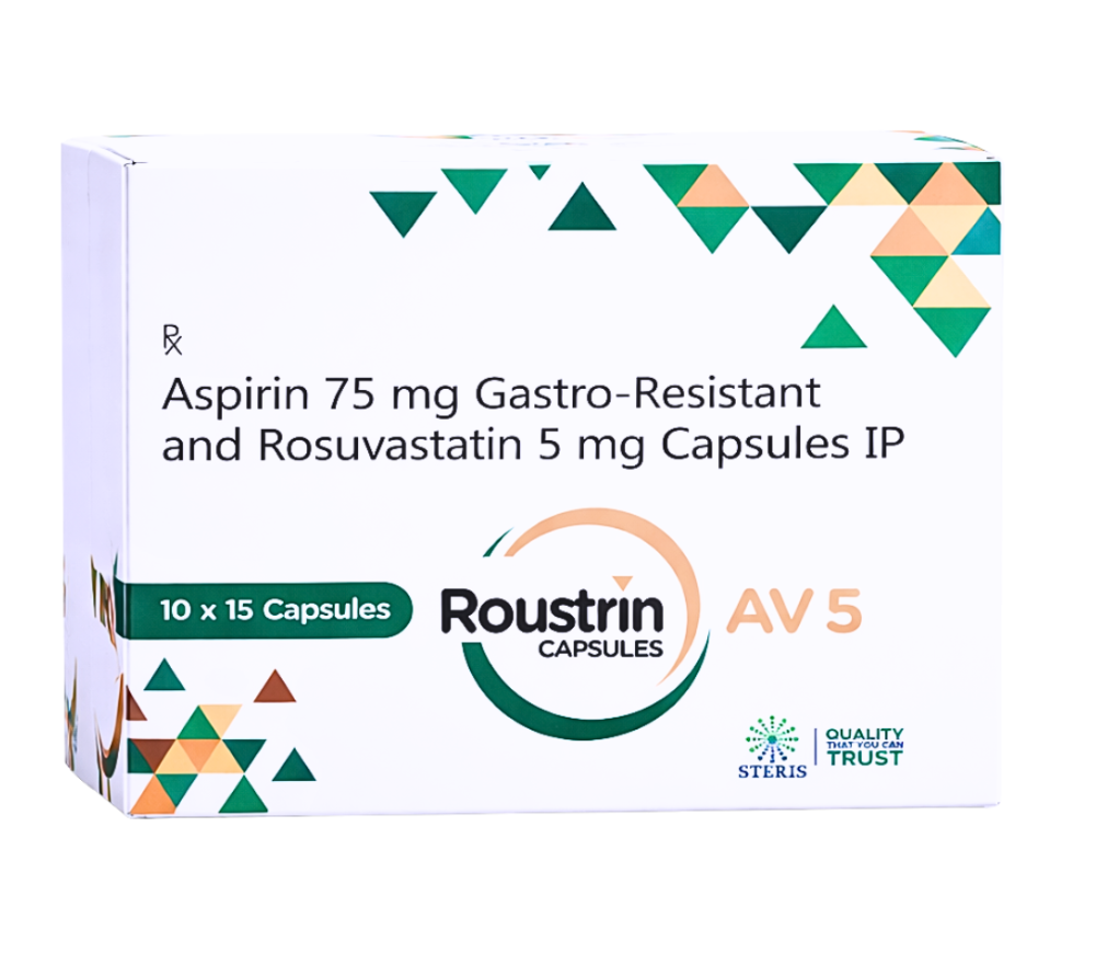 ROUSTRIN AV 5 is a clinically advanced combination medication that contains Aspirin 75 mg (Gastro-Resistant) and Rosuvastatin 5 mg Capsules. This dual-action formulation is widely prescribed for the prevention and management of cardiovascular diseases, including heart attacks, strokes, and high cholesterol levels.