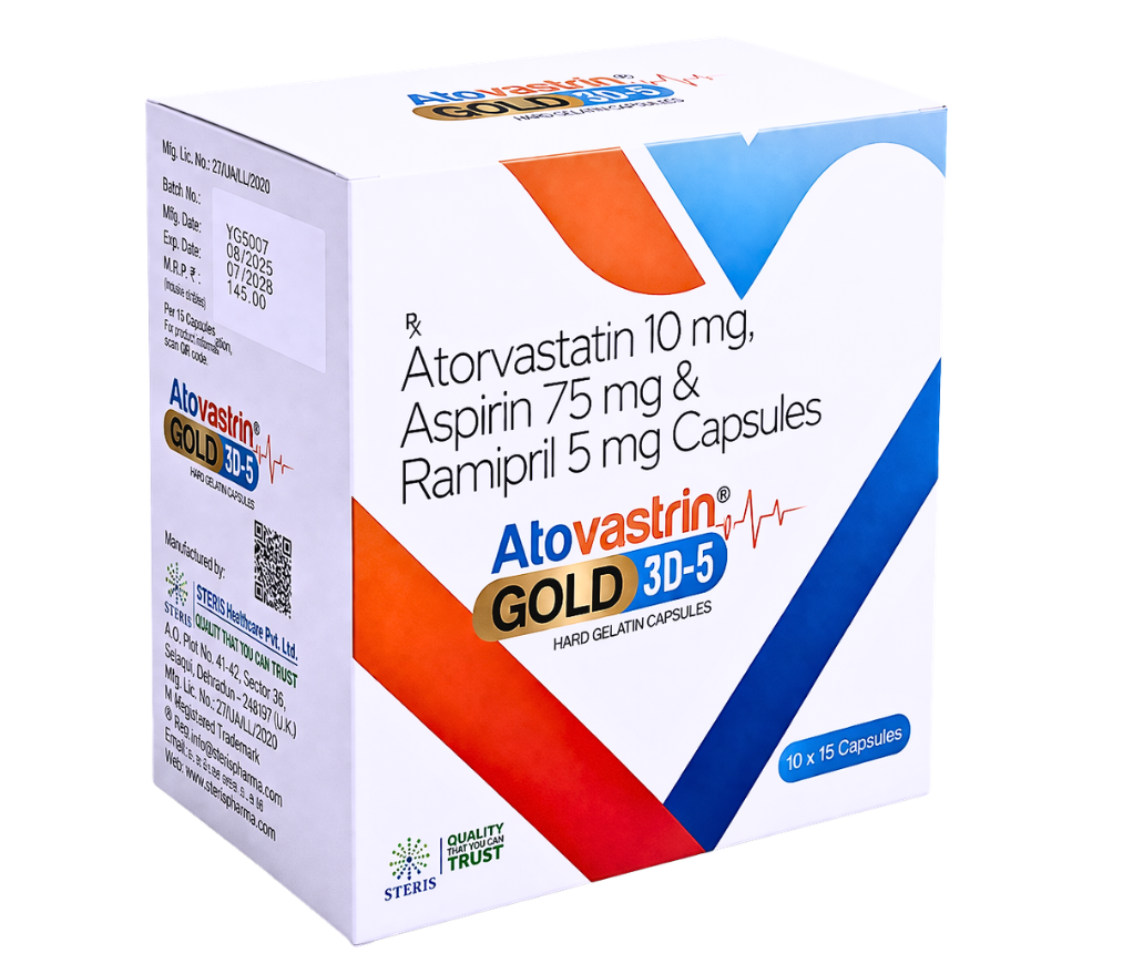 ATOVASTRIN GOLD 3D-5 is a comprehensive cardiovascular care medication formulated with Atorvastatin 10 mg, Aspirin 75 mg, and Ramipril 5 mg. This advanced triple combination is specifically designed to reduce the risk of heart-related complications such as heart attack, stroke, and uncontrolled hypertension.
