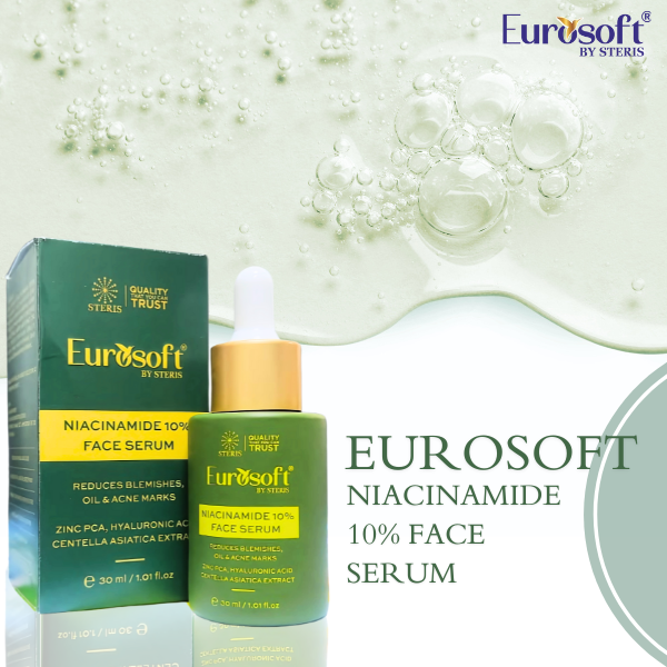 Eurosoft Niacinamide 10% Face Serum एक अत्यधिक प्रभावी और सुरक्षित सीरम है, जो त्वचा के कई प्रकार की समस्याओं से निपटने में मदद करता है। यदि आपकी त्वचा पर blemishes, oil & acne marks, या dark spots हैं, तो यह सीरम आपके लिए आदर्श हो सकता है। इसके Niacinamide, Hyaluronic Acid, Zinc PCA, और Centella Asiatica Extract जैसे घटक आपकी त्वचा को न केवल निखारते हैं, बल्कि उसे स्वस्थ और चमकदार भी बनाते हैं। नियमित रूप से इसका उपयोग करने से आपकी त्वचा को हर प्रकार की त्वचा संबंधी समस्याओं से छुटकारा मिलेगा और यह ताजगी से भरी हुई दिखेगी। Steris Healthcare Pvt Ltd, known as Sterispharma, was founded in February 2018 by a team of experienced professionals in the pharmaceutical industry. Headquartered in Navi Mumbai, the company holds certifications from WHO, GMP, and ISO, reflecting its dedication to maintaining high standards of quality and safety. Sterispharma’s mission is to provide affordable, high-quality medications across India, strictly adhering to WHO guidelines. With the convenience of an online pharmacy, customers can easily order medicines with home delivery options. The company offers a wide range of healthcare products, catering to various medical needs, from rare disease treatments to essential healthcare products. Sterispharma\'s product range includes solutions for Cardiology, Asthma, Respiratory Issues, Nasal Conditions, Diabetes, Endocrinology, Gastroenterology, Orthopedics, Anti-infectives/Antibiotics, General Medicine, Urology, Neurology, Nephrology, Oncology, Gynecology, Pediatrics, Dental Care, and Dermatology. Medicines can be conveniently ordered via Our websites—Sterisonline, Sterisindia, and Sterispharma.