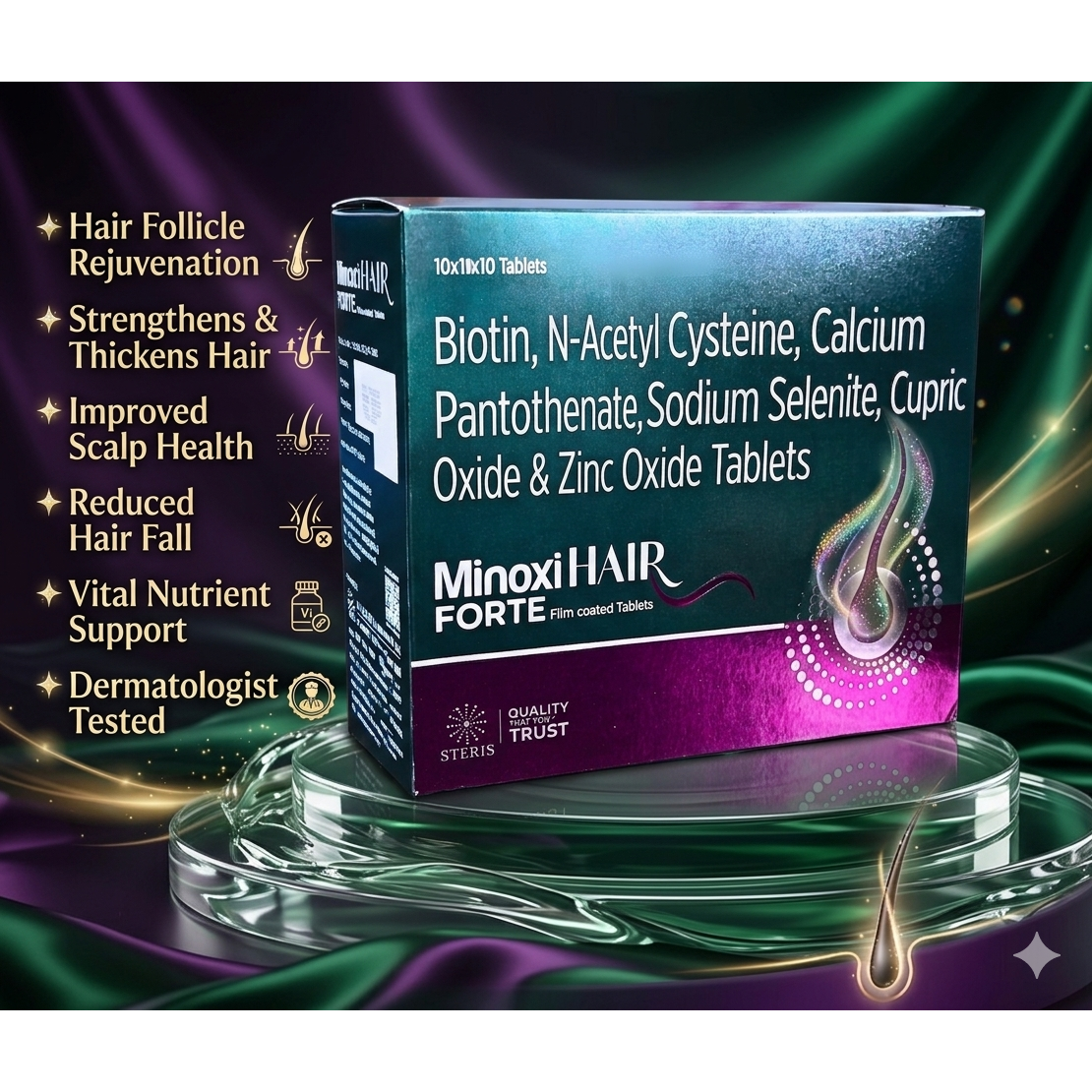Hair health is a reflection of overall wellness, and deficiencies in essential vitamins and minerals can lead to hair thinning, hair fall, and brittle strands. MINOXIHAIR FORTE is a scientifically formulated supplement designed to support healthy hair growth and strengthen hair follicles. Enriched with a combination of key ingredients including Biotin, N-Acetyl Cysteine, Calcium Pantothenate, Sodium Selenite, Cupric Oxide, and Zinc Oxide, this tablet addresses nutritional gaps that can impact hair vitality.