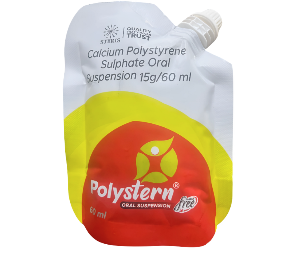 Polystern Oral Suspension (Calcium Polystyrene Sulfonate 15g/60ml) is available in pharmacies and hospitals, marketed by pharmaceutical companies including Steris Healthcare Pvt Ltd.