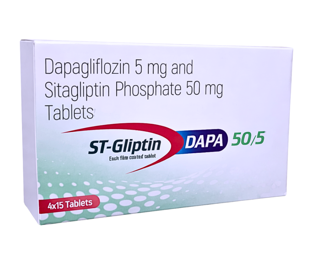 Dapagliflozin 5mg and Sitagliptin Phosphate 50 mg Tablets, available under the brand name ST- GLIPTIN DAPA 50/5 by Steris Healthcare Pvt. Ltd., is a powerful combination therapy designed for the effective management of Type 2 Diabetes Mellitus. This advanced formulation combines two well-established anti-diabetic agents—Dapagliflozin and Sitagliptin—to provide comprehensive blood sugar control through dual mechanisms of action.