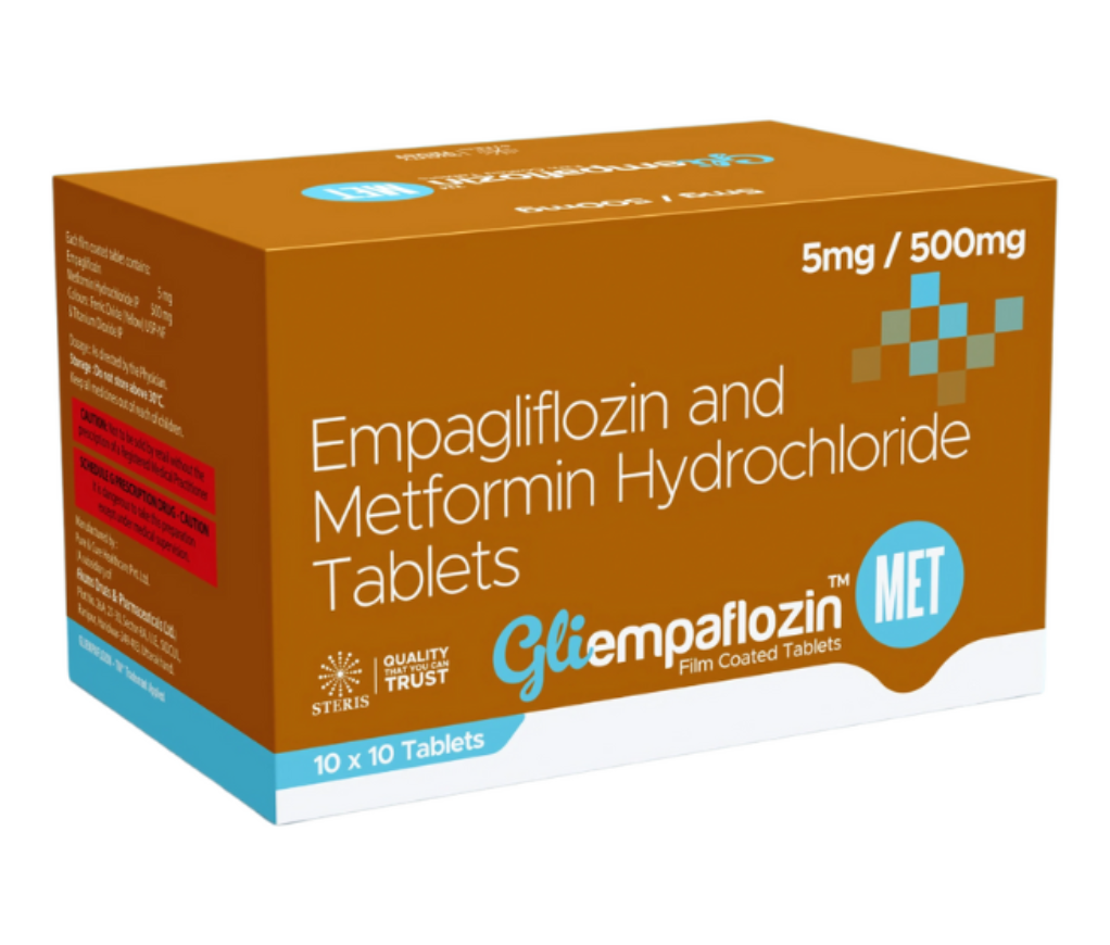 GLIEMPAFLOZIN MET 5mg/500mg is an advanced oral antidiabetic formulation combining Empagliflozin 5 mg and Metformin Hydrochloride 500 mg. This dual-action therapy is widely prescribed for adults with Type 2 Diabetes Mellitus (T2DM) who require better glycaemic control when diet and lifestyle modifications alone are not sufficient. By bringing together the complementary benefits of an SGLT2 inhibitor (Empagliflozin) and a biguanide (Metformin), the medicine supports stable blood sugar reduction and helps minimise diabetes-related complications.