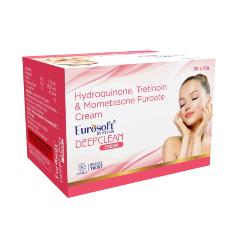 EUROSOFT DEEPCLEAN is a combination cream containing hydroquinone, tretinoin, and mometasone furoate. It is used to treat hyperpigmentation, melasma, acne scars, and uneven skin tone. It also helps reduce inflammation and improve overall skin texture.