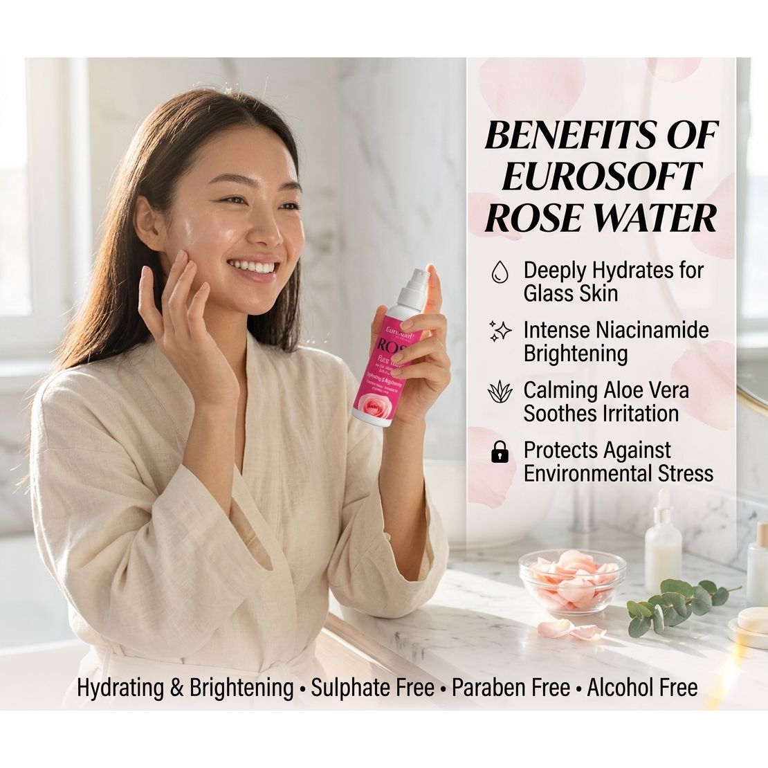 In today’s fast-paced world, skin faces constant exposure to environmental pollutants, dust, and daily makeup, leading to clogged pores, dullness, and irritation. A well-formulated face toner is essential for maintaining clean, hydrated, and balanced skin. EUROSOFT ROSE FACE TONER is a premium skincare solution designed to cleanse, refresh, and rejuvenate your skin naturally. Its unique formulation combines botanical extracts and scientifically backed ingredients to provide deep hydration, gentle cleansing, and soothing care.