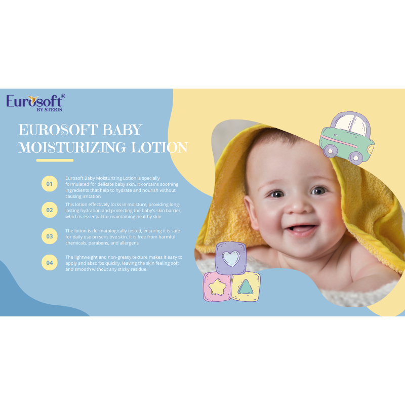 Keeping your baby’s delicate skin healthy, soft, and protected is every parent\'s top priority. Eurosoft Baby Moisturizing Lotion is a specially crafted formula designed to deliver the care and nourishment your baby’s skin deserves. From soothing inflamed skin to ensuring a hypoallergenic experience, this lotion has it all.Baby skin is incredibly sensitive and prone to dryness, irritation, and environmental stressors. It demands products free from harsh chemicals, enriched with moisturizing agents, and gentle enough for daily use. Eurosoft Baby Moisturizing Lotion is a trusted companion in maintaining the natural softness and suppleness of your baby’s skin.