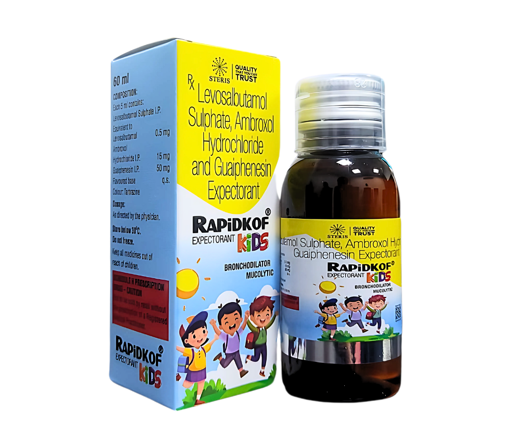 RAPIDKOF KIDS Expectorant, containing Levosalbutamol Sulphate, Ambroxol Hydrochloride, and Guaiphenesin, is an effective and reliable solution for managing productive cough and chest congestion in children. Its multi-action approach helps open airways, loosen thick mucus, and facilitate easy expectoration, providing faster and more complete relief.