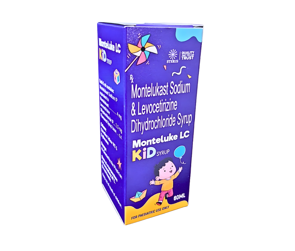 MONTELUKE LC KID SYRUP, containing Montelukast Sodium and Levocetirizine Dihydrochloride, is an effective pediatric anti-allergic medicine designed to manage respiratory and nasal allergy symptoms in children. The combination of a leukotriene receptor antagonist and an antihistamine provides comprehensive relief from symptoms such as sneezing, nasal congestion, runny nose, itching, and allergy-related cough.