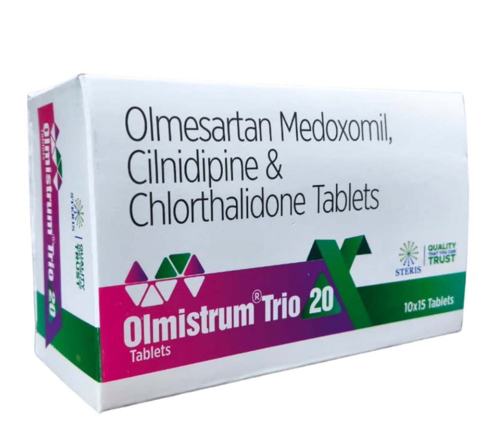OLMISTRUM TRIO 20 is a highly effective combination therapy containing Olmesartan Medoxomil 20 mg, Cilnidipine 10 mg & Chlorthalidone 12.5 mg Tablets, designed to provide comprehensive blood pressure management. Its triple-action mechanism ensures better control of hypertension, reduces cardiovascular risks, and improves long-term health outcomes.