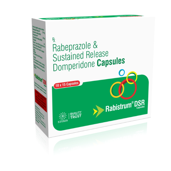 RABISTRUM DSR 20 is a powerful combination of Rabeprazole (20mg) and Domperidone (30mg SR) that effectively treats a range of gastrointestinal disorders, providing long-term relief from acid reflux, indigestion, and discomfort caused by gastric motility issues. Its dual action—reducing stomach acid and improving digestion—makes it a highly effective solution for those struggling with digestive disturbances.Steris Healthcare Pvt Ltd, known as Sterispharma, was founded in February 2018 by a team of experienced professionals in the pharmaceutical industry. Headquartered in Navi Mumbai, the company holds certifications from WHO, GMP, and ISO, reflecting its dedication to maintaining high standards of quality and safety. Sterispharma’s mission is to provide affordable, high-quality medications across India, strictly adhering to WHO guidelines. With the convenience of an online pharmacy, customers can easily order medicines with home delivery options. The company offers a wide range of healthcare products, catering to various medical needs, from rare disease treatments to essential healthcare products. Sterispharma\'s product range includes solutions for Cardiology, Asthma, Respiratory Issues, Nasal Conditions, Diabetes, Endocrinology, Gastroenterology, Orthopedics, Anti-infectives/Antibiotics, General Medicine, Urology, Neurology, Nephrology, Oncology, Gynecology, Pediatrics, Dental Care, and Dermatology. Medicines can be conveniently ordered via Our websites—Sterisonline, Sterisindia, and Sterispharma.