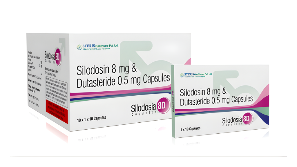 Silodosin 8 mg Dutasteride 0.5 mg capsules under the brand name SILODOSOLID 8D are a combination therapy designed for the treatment of benign prostatic hyperplasia (BPH) — a common condition in older men that causes enlargement of the prostate gland, leading to urinary problems. This fixed-dose combination contains: