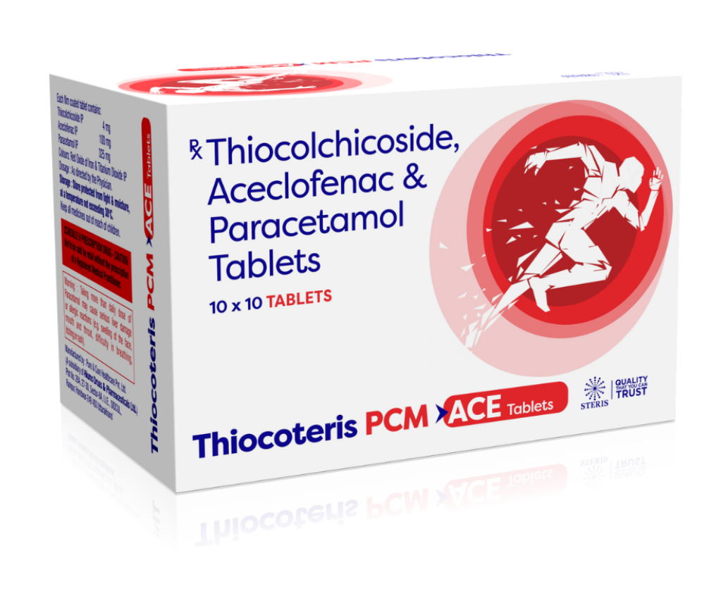 THIOCOTERIS PCM ACE is a powerful combination medicine formulated to provide fast and effective relief from pain, inflammation, and muscle spasms. It contains Thiocolchicoside 4mg, Aceclofenac 100mg, and Paracetamol 352mg, each playing a distinct role in targeting musculoskeletal discomfort.