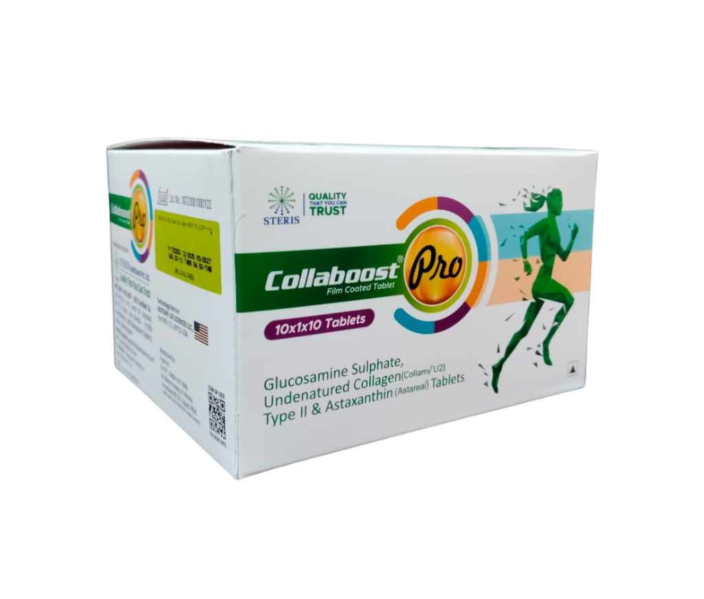 COLLABOOST PRO Glucosamine Sulphate (1500mg) , Undenatured Collagen (40mg) & Astaxanthin (4mg) COLLABOOST PRO is a specialized dietary supplement formulated to support joint health and mobility. It combines powerful ingredients like Glucosamine Sulphate, Undenatured Collagen, and Astaxanthin to promote joint flexibility, reduce inflammation, and enhance overall joint function. Key Ingredients: Glucosamine Sulphate (1500mg): Known for its role in supporting cartilage health and joint lubrication, Glucosamine Sulphate helps maintain joint flexibility and comfort. Undenatured Collagen (40mg): Collagen is crucial for maintaining the structural integrity of joints and promoting elasticity. Undenatured collagen specifically supports joint function and reduces collagen degradation. Astaxanthin (4mg): A potent antioxidant, Astaxanthin helps combat oxidative stress and inflammation in joints, contributing to reduced joint pain and stiffness. Key Benefits: Supports joint health and mobility Reduces joint pain and inflammation Helps maintain cartilage and joint structure Supports collagen synthesis and elasticity How Does It Work? COLLABOOST PRO works through its synergistic blend of Glucosamine Sulphate, Undenatured Collagen, and Astaxanthin. Glucosamine Sulphate provides essential building blocks for cartilage repair and maintenance. Undenatured Collagen supports collagen production, crucial for joint structure and flexibility. Astaxanthin acts as a potent antioxidant, protecting joints from oxidative damage and inflammation. Directions for Use: Take 1 capsule of COLLABOOST PRO daily with a meal, or as directed by your healthcare professional. For optimal results, continue daily use as recommended. Side Effects: Generally well-tolerated when used as directed. However, some individuals may experience mild gastrointestinal symptoms such as nausea, diarrhea, or indigestion. Discontinue use and consult a healthcare provider if adverse reactions occur. Safety Information: Consult your healthcare provider before using COLLABOOST PRO, especially if pregnant, nursing, or under medical supervision. Keep out of reach of children. Store in a cool, dry place away from direct sunlight.
