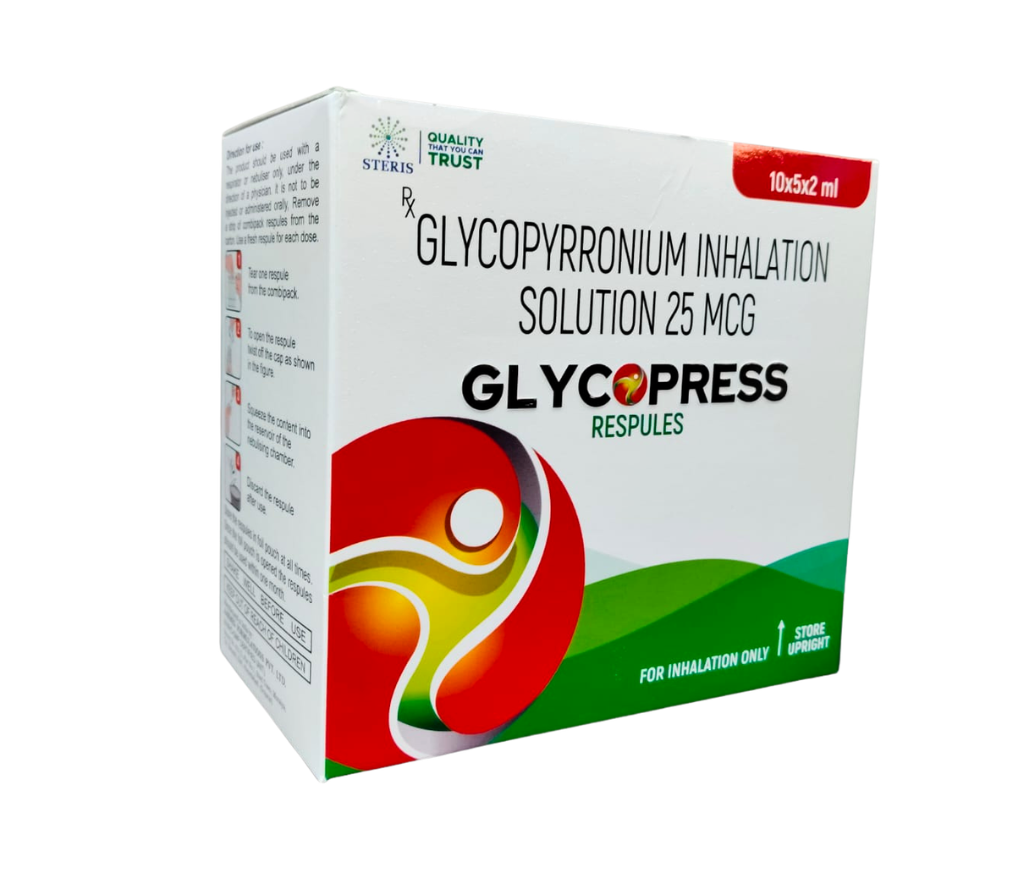 Glycopyrronium inhalation solution 25 mcg GLYCOPRESS is a specialized pharmaceutical solution designed to effectively manage conditions involving excessive secretions in the body. This medication contains Glycopyrrolate IP, which is equivalent to Glycopyrronium 25mcg, and is presented in a 2ml isotonic solution. GLYCOPRESS is commonly used in clinical settings for patients requiring a reduction in bodily fluids, such as saliva or mucus, to improve comfort and manage symptoms related to various medical conditions. Key Benefits Reduces Excessive Secretions: GLYCOPRESS effectively reduces saliva, mucus, and other bodily secretions, providing relief for patients with conditions like COPD and sialorrhea. Enhances Respiratory Function: By decreasing mucus production, GLYCOPRESS helps keep airways clear, which is particularly beneficial for patients with respiratory conditions. Preoperative Use: GLYCOPRESS is often administered before surgery to reduce secretions and maintain clear airways, lowering the risk of complications during procedures. Convenient Dosage Form: The 2ml isotonic solution ensures that the medication is easy to administer and is quickly absorbed by the body, providing fast relief. How Does It Work? GLYCOPRESS works by blocking the action of acetylcholine, a neurotransmitter that stimulates glandular secretions in the body. By inhibiting acetylcholine's effects on muscarinic receptors, Glycopyrrolate reduces the production of fluids such as saliva, mucus, and stomach acid. This action makes GLYCOPRESS particularly useful in managing conditions where excessive secretions are problematic, such as in respiratory diseases or as a preparation for surgery. The isotonic solution in which Glycopyrrolate is dissolved ensures that the medication is compatible with the body's natural fluids, facilitating smooth and effective administration, whether intravenously or intramuscularly. Directions for Use GLYCOPRESS is typically administered by a healthcare professional through intravenous or intramuscular injection. The dosage and frequency of administration depend on the specific condition being treated and the patient's response to the medication. It is important to follow the healthcare provider's instructions closely to ensure optimal effectiveness and minimize potential risks. For COPD: Administer 1 ml (12.5 mcg) to 2 ml (25 mcg) twice daily, as recommended by a healthcare provider. For Sialorrhea: Administer 1 ml (12.5 mcg) to 2 ml (25 mcg) once or twice daily, based on the severity of symptoms. For Preoperative Use: A single dose of 2 ml (25 mcg) is typically given 30-60 minutes before surgery. Side Effects While GLYCOPRESS is generally well-tolerated, some patients may experience side effects. The most common side effects include: Dry Mouth: A reduction in saliva production may lead to a dry mouth, which can be alleviated by drinking water or using saliva substitutes. Blurred Vision: Temporary blurred vision may occur, especially at higher doses. Urinary Retention: Some patients may find it difficult to urinate due to the anticholinergic effects of the medication. Constipation: By slowing gut motility, Glycopyrrolate can cause constipation, particularly with long-term use. Increased Heart Rate: In rare instances, Glycopyrrolate may cause tachycardia (a fast heart rate), which should be monitored by a healthcare provider.