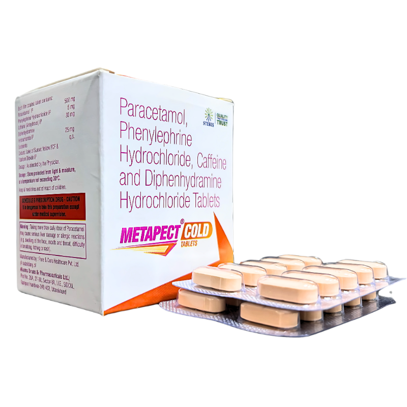METAPECT COLD – Comprehensive Relief for Cold & Flu Symptoms METAPECT COLD is a thoughtfully formulated combination medicine designed to relieve multiple symptoms associated with the common cold, including fever, nasal congestion, runny nose, headaches, and body aches. It contains four active ingredients: Paracetamol IP (500 mg) Phenylephrine Hydrochloride IP (5 mg) Caffeine IP (30 mg) Diphenhydramine Hydrochloride IP (25 mg) Together, these components work synergistically to ease discomfort, reduce inflammation, and restore comfort during colds and flu. Key Benefits: Fast relief from fever, headaches, and body aches Unblocks nasal passages for easier breathing Reduces sneezing, watery eyes, and runny nose due to allergies Relieves sinus pressure and congestion Boosts alertness and counteracts drowsiness associated with cold symptoms How It Works: Paracetamol lowers fever and alleviates pain by blocking pain-inducing chemicals. Phenylephrine acts as a nasal decongestant by reducing swelling in nasal tissues. Caffeine enhances the pain-relieving effect of paracetamol and combats drowsiness. Diphenhydramine is an antihistamine that reduces sneezing, nasal discharge, and other allergic symptoms. Directions for Use: Take 1 tablet every 4 to 6 hours as needed, or as advised by your doctor. Do not exceed 4 tablets in 24 hours. Swallow whole with water; can be taken with or without food. Not suitable for children below 12 years of age. Possible Side Effects: Though generally safe, some users may experience mild side effects such as: Drowsiness or dizziness Nausea or stomach discomfort Dry mouth Increased heart rate Restlessness or trouble sleeping Seek immediate medical help if you experience severe reactions like difficulty breathing, intense dizziness, or signs of an allergic reaction.