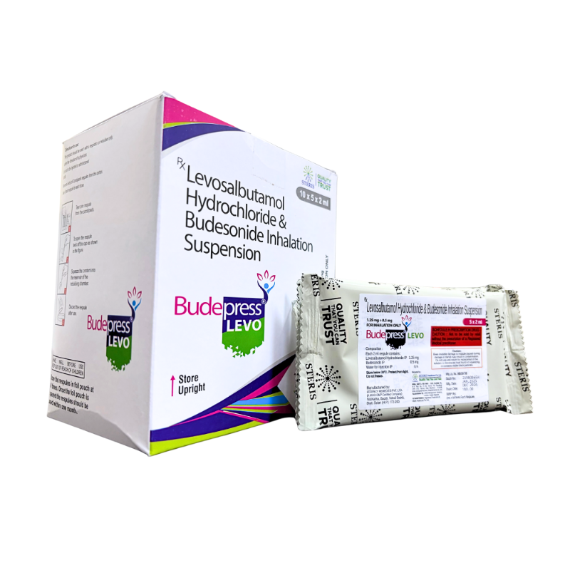 R.S. BUDEPRESS LEVO is a powerful dual-action inhalation suspension combining Levosalbutamol Hydrochloride (1.25 mg) and Budesonide (0.5 mg), formulated to provide rapid relief and long-term control of respiratory conditions. Levosalbutamol is a short-acting beta2-agonist (SABA) that works by relaxing airway muscles, providing quick relief from bronchospasms, while Budesonide, a corticosteroid, targets inflammation in the lungs to reduce swelling, mucus, and irritation. This combination ensures fast symptom relief along with long-term management of conditions like asthma and COPD. Uses R.S. BUDEPRESS LEVO is indicated for: Immediate relief from bronchospasms and wheezing. Maintenance therapy for asthma and Chronic Obstructive Pulmonary Disease (COPD). Prevention of asthma attacks and COPD exacerbations. Reduction of shortness of breath, coughing, and chest tightness. Improvement of airflow and lung function in patients with chronic respiratory conditions. This inhalation suspension is designed for nebulizer use, delivering medication directly to the lungs for maximum efficacy. Benefits Dual-Action Therapy: Combines a fast-acting bronchodilator with an anti-inflammatory corticosteroid for comprehensive respiratory care. Rapid Relief: Levosalbutamol provides quick alleviation of wheezing and breathlessness. Long-Term Control: Budesonide helps prevent airway inflammation and reduces the risk of flare-ups. Improved Lung Function: Enhances oxygen intake and overall respiratory efficiency. Convenient Nebulizer Use: Delivers the medication directly to the lungs for faster and more effective action. Reduces Hospitalizations: Regular use can decrease emergency visits due to asthma or COPD exacerbations. Dosage Adults: Usually, 1 nebulizer dose twice daily, or as prescribed by a healthcare professional. Children: Dosage must be adjusted by a pediatrician. Administer using a nebulizer, inhaling the mist slowly and deeply through the mouthpiece until the full dose is delivered. Rinse your mouth after each use to reduce the risk of oral thrush. Do not alter the dose or frequency without medical guidance. Side Effects Common side effects may include: Throat irritation or hoarseness Cough Mild headache or dizziness Palpitations or mild tremors Oral fungal infection (oral thrush) Serious side effects are rare but may include allergic reactions, severe difficulty breathing, or rapid heart rate. Seek immediate medical help if these occur. Precautions and Warning Pregnancy & Breastfeeding: Only use under medical supervision. Heart Conditions: Consult a doctor if you have hypertension, arrhythmia, or cardiovascular disease. Not for Acute Attacks: Keep a rescue inhaler for sudden asthma symptoms. Immunocompromised Patients: May increase susceptibility to infections. Allergies: Avoid if allergic to Levosalbutamol, Budesonide, or any excipients. Storage: Keep in a cool, dry place below 30°C, away from sunlight and out of reach of children. Conclusion R.S. BUDEPRESS LEVO (Levosalbutamol 1.25 mg + Budesonide 0.5 mg Inhalation Suspension) is a clinically proven dual-action inhalation therapy that provides fast relief from bronchospasms while offering long-term anti-inflammatory control. It helps reduce the frequency of asthma and COPD attacks, improves lung function, and enhances overall respiratory health. With proper and regular use, R.S. BUDEPRESS LEVO ensures patients experience better breathing, fewer exacerbations, and an improved quality of life, making it an essential solution for chronic respiratory management.