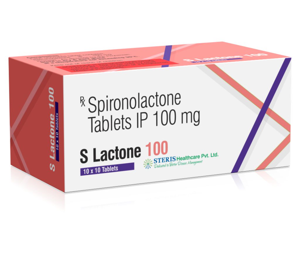Spironolactone 100mg S LACTONE is a medication primarily used to treat fluid retention (edema) in conditions such as heart failure, liver disease, and kidney disease. S LACTONE belongs to a class of medications called potassium-sparing diuretics. Diuretics are medications that help your body get rid of extra salt (sodium) and water through urine, thereby reducing fluid buildup in the body. Spironolactone is an combination medicines used to treat high blood pressure (hypertension) and heart failure. Aside from its diuretic effect, S LACTONE also acts as an aldosterone antagonist. Aldosterone is a hormone produced by the adrenal glands that helps regulate the balance of sodium and potassium in the body. By blocking the action of aldosterone, S LACTONE helps to retain potassium while excreting sodium and water, which can be beneficial in conditions where the body retains too much sodium and water.
