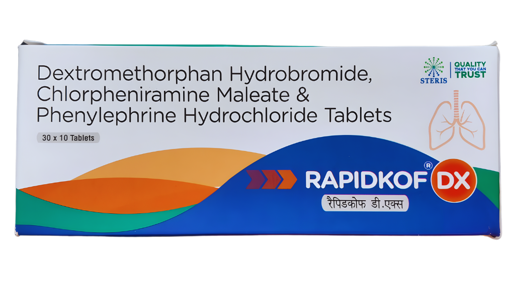 RAPIDKOF DX, containing Dextromethorphan Hydrobromide 10 mg, Chlorpheniramine Maleate 2 mg, and Phenylephrine Hydrochloride 5 mg, is a comprehensive, multi-symptom relief medication for cold, cough, and allergy management. By targeting cough, nasal congestion, and allergic symptoms simultaneously, it provides fast, effective, and convenient relief, allowing patients to continue daily activities with minimal discomfort.
