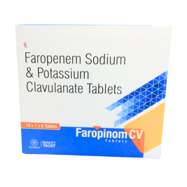 Faropinom CV is a highly effective and reliable combination of Faropenem Sodium and Potassium Clavulanate, designed to combat a wide range of bacterial infections, including those caused by resistant strains. Its broad-spectrum activity, combined with its ability to address resistant bacteria, makes it an invaluable tool in the treatment of various infections, from respiratory to urinary and beyond. Steris Healthcare Pvt Ltd, known as Sterispharma, was founded in February 2018 by a team of experienced professionals in the pharmaceutical industry. Headquartered in Navi Mumbai, the company holds certifications from WHO, GMP, and ISO, reflecting its dedication to maintaining high standards of quality and safety. Sterispharma’s mission is to provide affordable, high-quality medications across India, strictly adhering to WHO guidelines. With the convenience of an online pharmacy, customers can easily order medicines with home delivery options. The company offers a wide range of healthcare products, catering to various medical needs, from rare disease treatments to essential healthcare products. Sterispharma\'s product range includes solutions for Cardiology, Asthma, Respiratory Issues, Nasal Conditions, Diabetes, Endocrinology, Gastroenterology, Orthopedics, Anti-infectives/Antibiotics, General Medicine, Urology, Neurology, Nephrology, Oncology, Gynecology, Pediatrics, Dental Care, and Dermatology. Medicines can be conveniently ordered via Our websites—Sterisonline, Sterisindia, and Sterispharma.