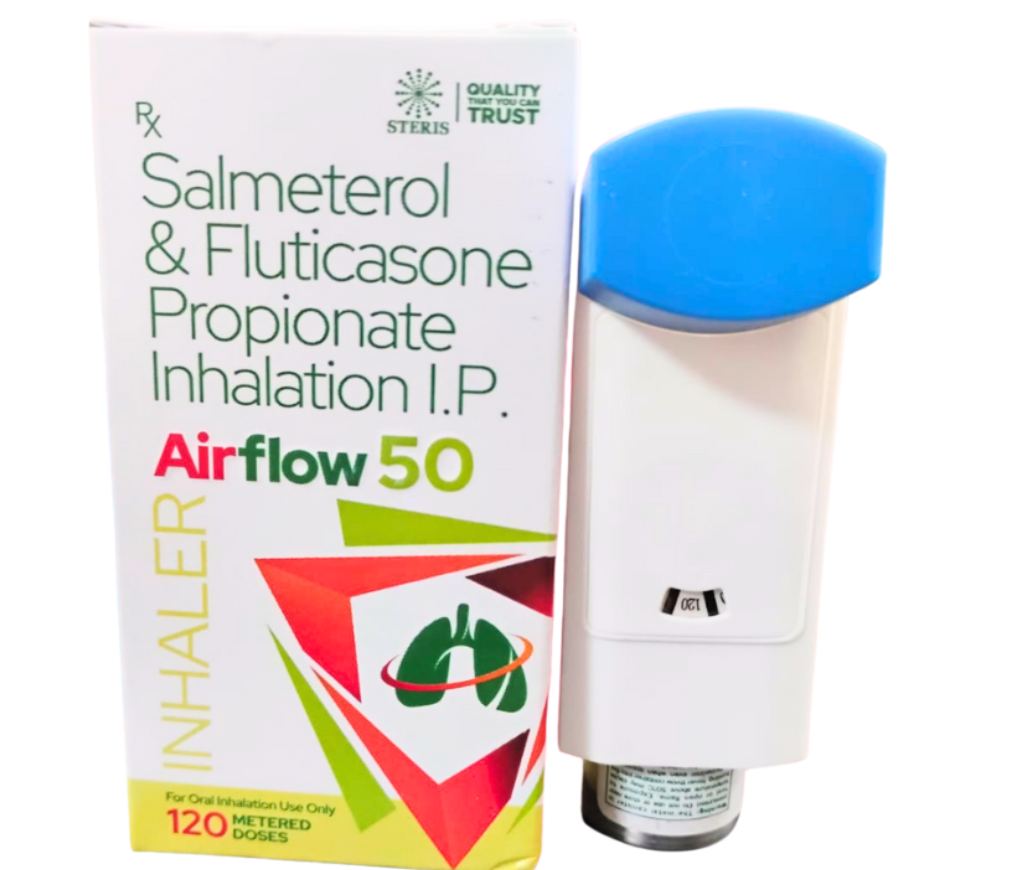 AIRFLOW 50 INH is a combination inhalation therapy formulated with Salmeterol 25 mg and Fluticasone Propionate 50 mg, two well-established medicines used for long-term control of asthma and chronic obstructive pulmonary disease (COPD). Designed to offer reliable symptomatic relief and sustained respiratory support, this inhaler helps improve lung function and reduces the frequency of breathing difficulties. It is commonly prescribed for patients who require both bronchodilator and anti-inflammatory action in a single inhalation therapy.