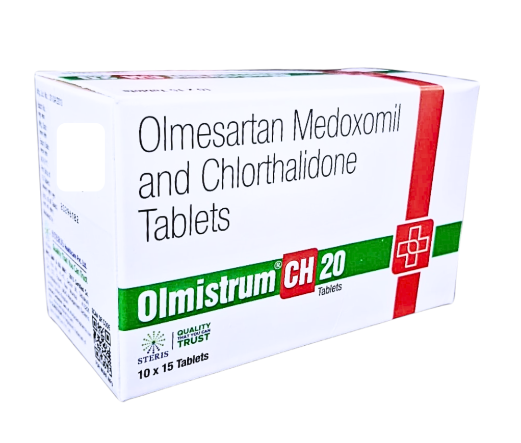 OLMISTRUM CH 20 is a clinically effective combination of Olmesartan 20 mg and Chlorthalidone (12.5 mg), specially formulated to manage high blood pressure (hypertension) and reduce the risk of serious cardiovascular complications. This dual-action therapy combines the benefits of an angiotensin II receptor blocker (ARB) and a thiazide-like diuretic, offering superior blood pressure control compared to single-drug treatments.