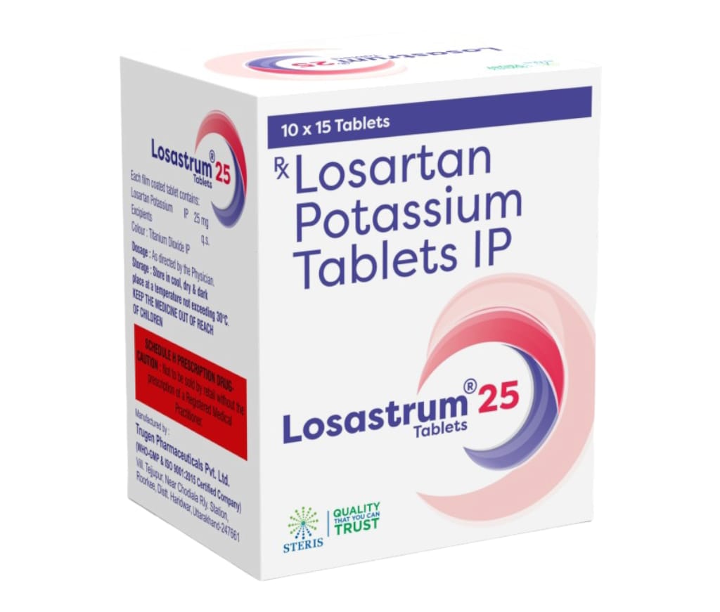 High blood pressure, or hypertension, is a common condition that can increase the risk of serious cardiovascular problems such as heart attack, stroke, and kidney disease. Managing blood pressure effectively is crucial for maintaining long-term health. LOSASTRUM 25, formulated with Losartan Potassium 25 mg, is an oral antihypertensive medication designed to help lower elevated blood pressure. Belonging to the class of angiotensin II receptor blockers (ARBs), Losartan works by relaxing blood vessels, reducing strain on the heart, and improving overall circulation. It is widely prescribed by healthcare professionals as a safe and effective solution for managing hypertension and protecting vital organs. Uses LOSASTRUM 25 is used in the treatment of several conditions related to high blood pressure and cardiovascular health: Essential Hypertension: Helps control elevated blood pressure and reduces the risk of heart disease and stroke. Kidney Protection in Diabetic Patients: Slows down the progression of kidney damage in patients with type 2 diabetes and proteinuria. Heart Failure Management: Supports improved heart function in certain patients with chronic heart failure (as directed by a physician). Post-Heart Attack Care: Reduces the risk of further cardiac events in specific cases. Benefits 1. Effective Blood Pressure Control Losartan works by blocking the action of angiotensin II, a hormone that constricts blood vessels, resulting in lower blood pressure and improved blood flow. 2. Kidney Protection Particularly beneficial for diabetic patients, LOSASTRUM 25 helps prevent kidney damage by reducing protein leakage and controlling blood pressure within safe ranges. 3. Cardiovascular Protection By easing the workload on the heart, it reduces the risk of stroke, heart attack, and other cardiovascular complications. 4. Well-Tolerated Formulation Losartan is generally well tolerated, making LOSASTRUM 25 suitable for long-term therapy under medical supervision. 5. Improved Quality of Life Effective blood pressure control helps patients maintain energy, focus, and overall wellbeing, reducing the long-term impact of hypertension on daily life. Dosage Recommended Dose: Typically, one tablet of LOSASTRUM 25 mg once daily, or as prescribed by your healthcare provider. Administration: Can be taken with or without food. Swallow the tablet whole with water. Dose Adjustment: Depending on individual response and medical conditions, the doctor may adjust the dosage. Monitoring: Regular blood pressure checks are advised to ensure optimal treatment efficacy. Important: Do not self-adjust the dose or discontinue medication without consulting your doctor, as sudden changes may increase cardiovascular risk. Side Effects LOSASTRUM 25 is generally safe, but some patients may experience mild side effects, including: Dizziness or lightheadedness Headache Fatigue or tiredness Nasal congestion Rare but Serious Side Effects Kidney function impairment Hyperkalemia (high potassium levels) Allergic reactions such as rash, swelling, or difficulty breathing If any serious or persistent symptoms occur, contact your healthcare provider immediately. Precautions and Warning Pregnancy and Breastfeeding: Not recommended during pregnancy; consult a doctor if breastfeeding. Kidney or Liver Disorders: Dose adjustments may be necessary, and close monitoring is advised. Electrolyte Imbalance: Regular blood tests may be needed to monitor potassium levels. Drug Interactions: Inform your doctor about all medications you are taking, especially other antihypertensives, diuretics, or potassium supplements. Lifestyle Measures: Along with medication, maintain a balanced diet, exercise regularly, and avoid excessive salt intake. Conclusion LOSASTRUM 25 (Losartan Potassium 25 mg) is a reliable and effective medication for managing high blood pressure and protecting cardiovascular and renal health. By blocking angiotensin II, it relaxes blood vessels, improves circulation, and reduces strain on the heart. When used as prescribed under medical supervision, LOSASTRUM 25 not only helps maintain optimal blood pressure but also enhances overall quality of life and reduces the risk of long-term complications associated with hypertension.